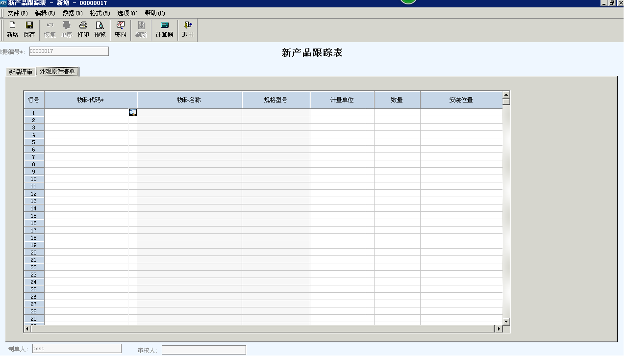 外观元件清单录入界面