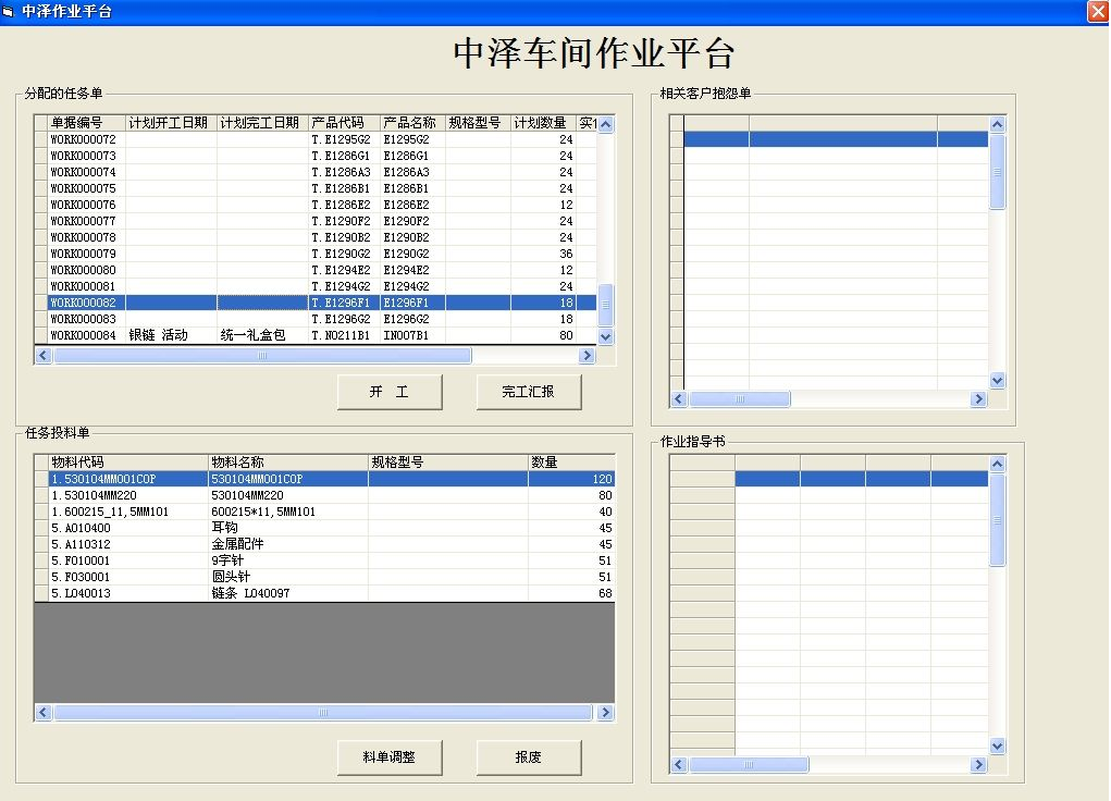 2) 车间班组长登陆系统时可以看见安排到自己的生产任务及任务的投料单、对应的图纸、工艺说明、存在的抱怨单。